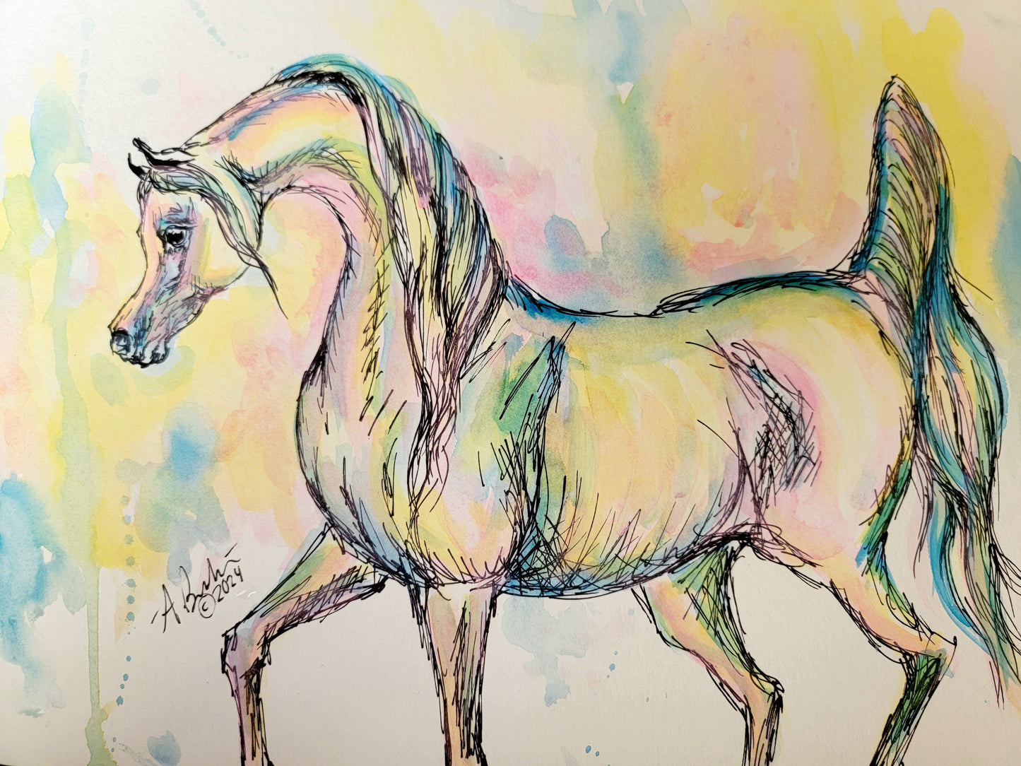 Indulge in the elegance and exoticism of this original A4 watercolor painting of an Arabian horse, masterfully captured in soft pastel rainbow hues and detailed with delicate pen and ink drawing. Each stroke and color evokes the beauty and grace of this majestic creature, making it a must-have for any art or horse lover. Unframed for your own personal touch.