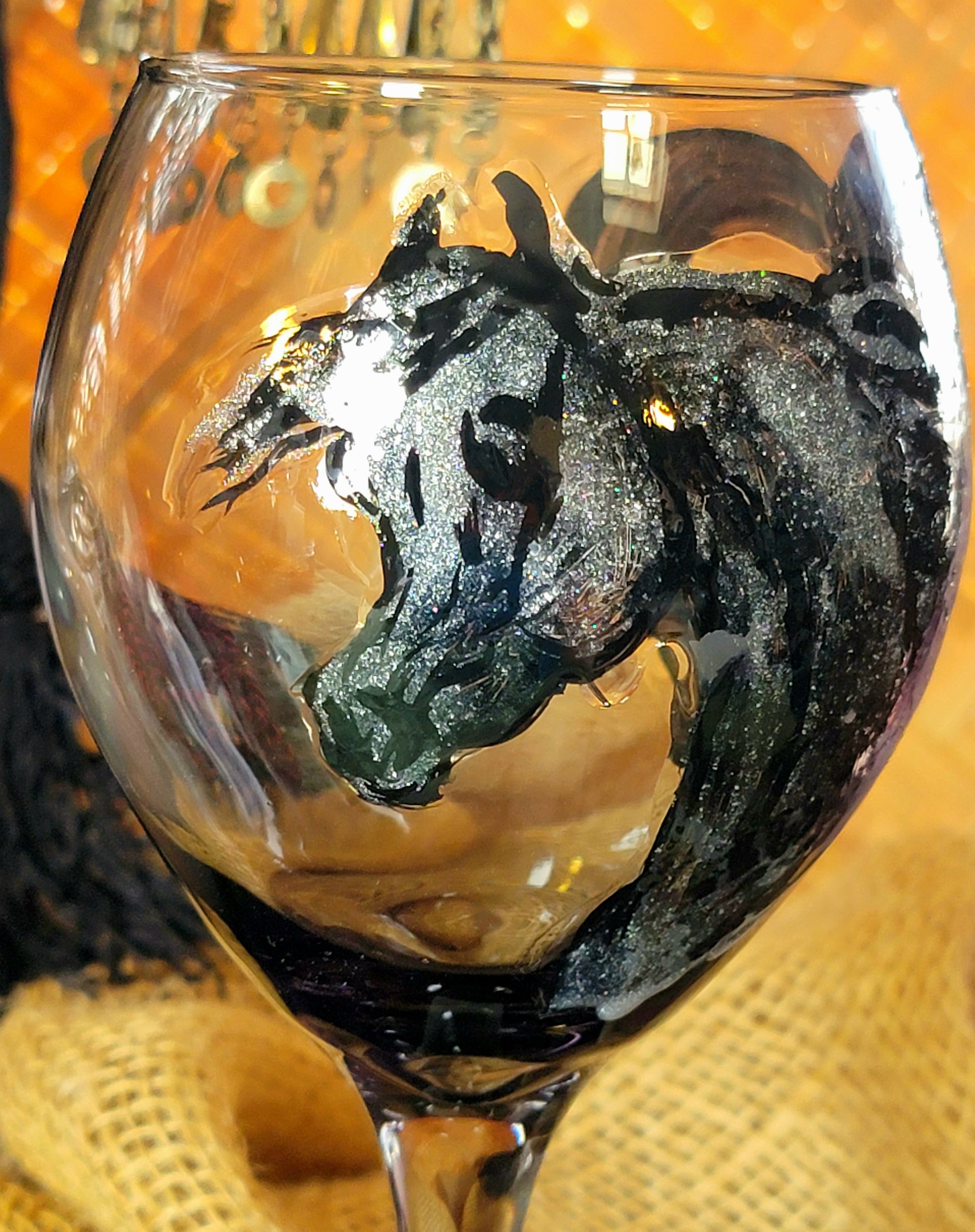 6 custom painted wine glasses, horse portraits. Stemless Clear