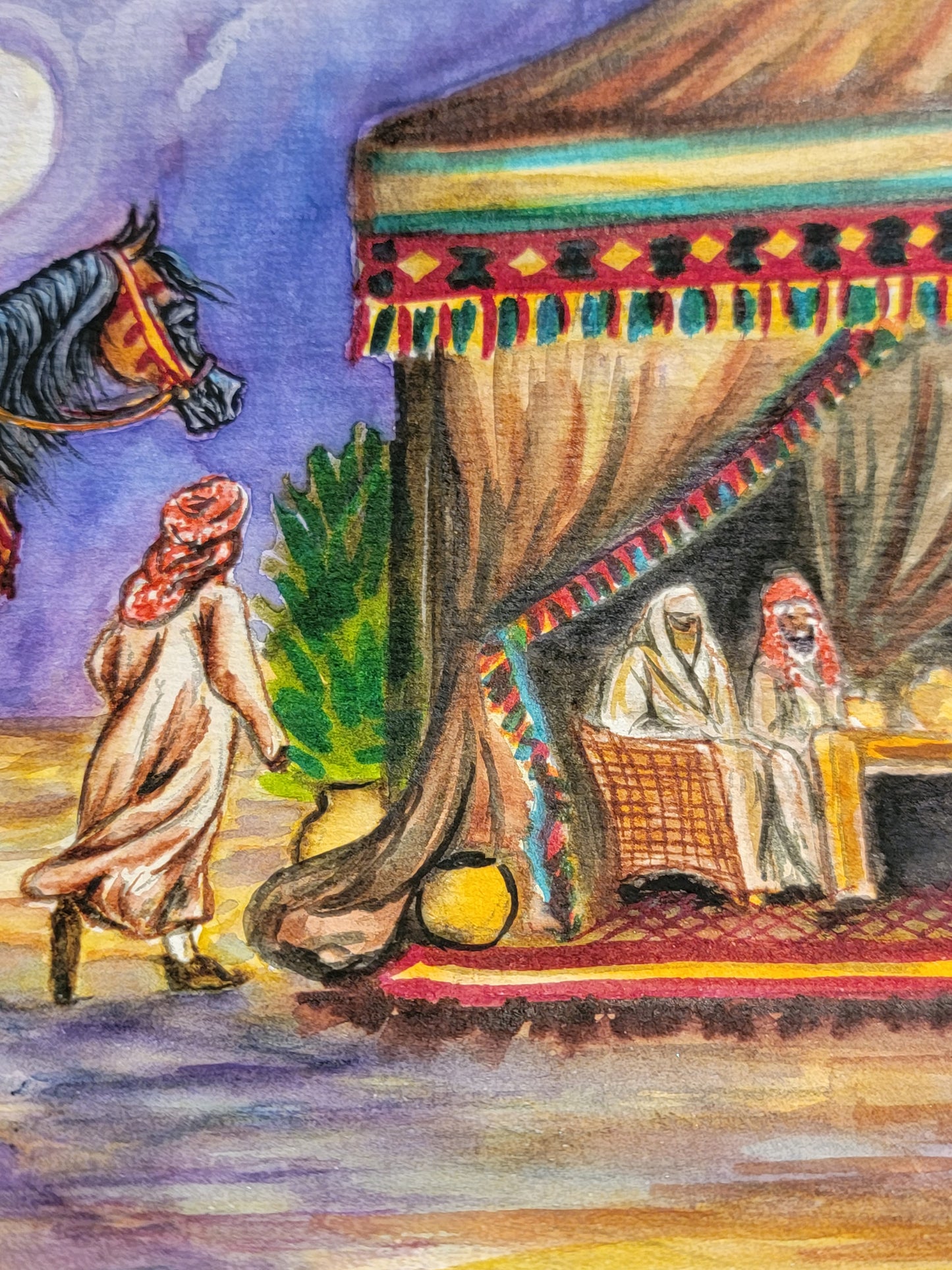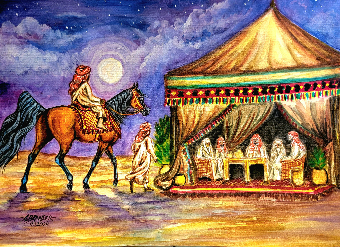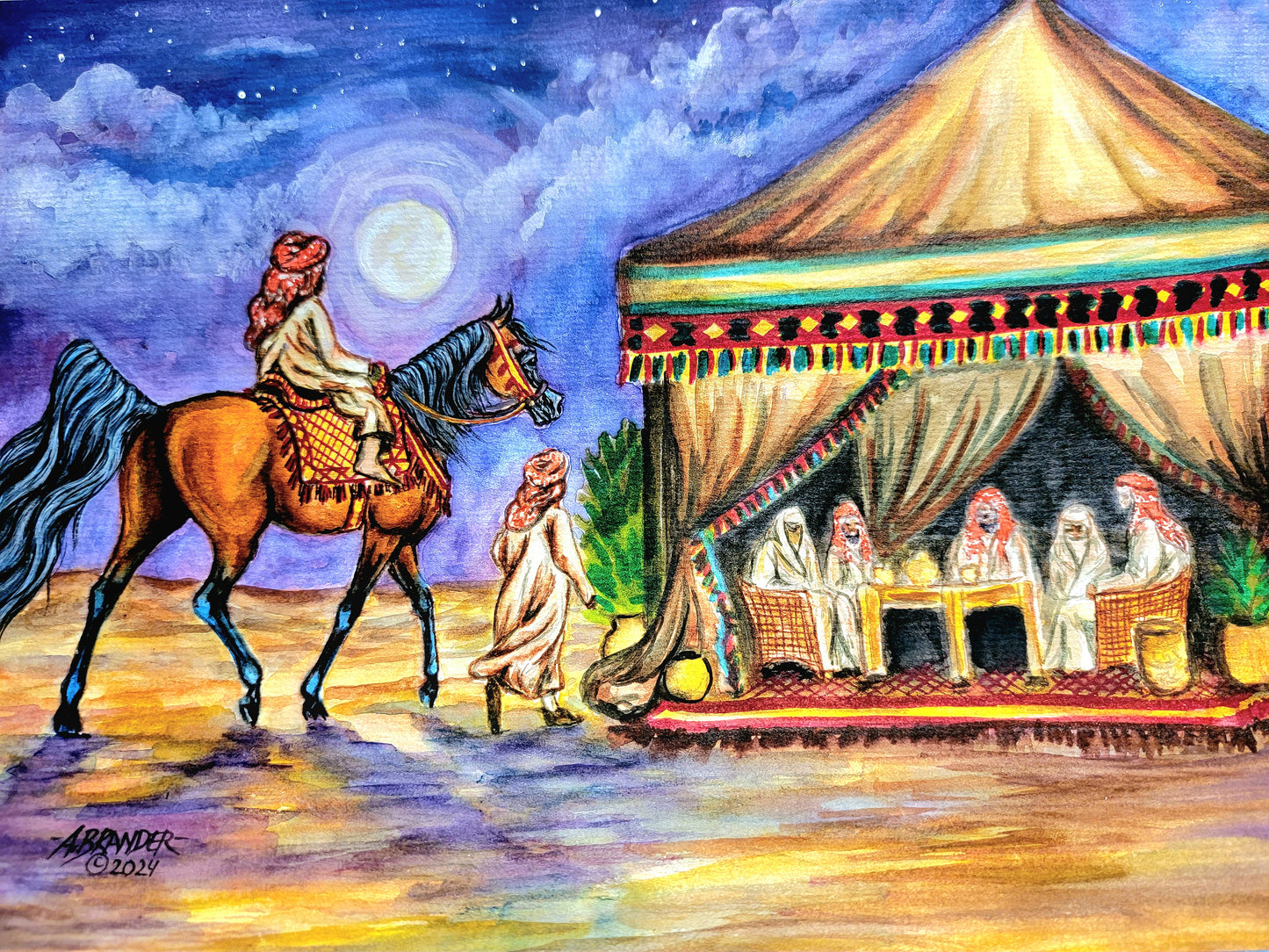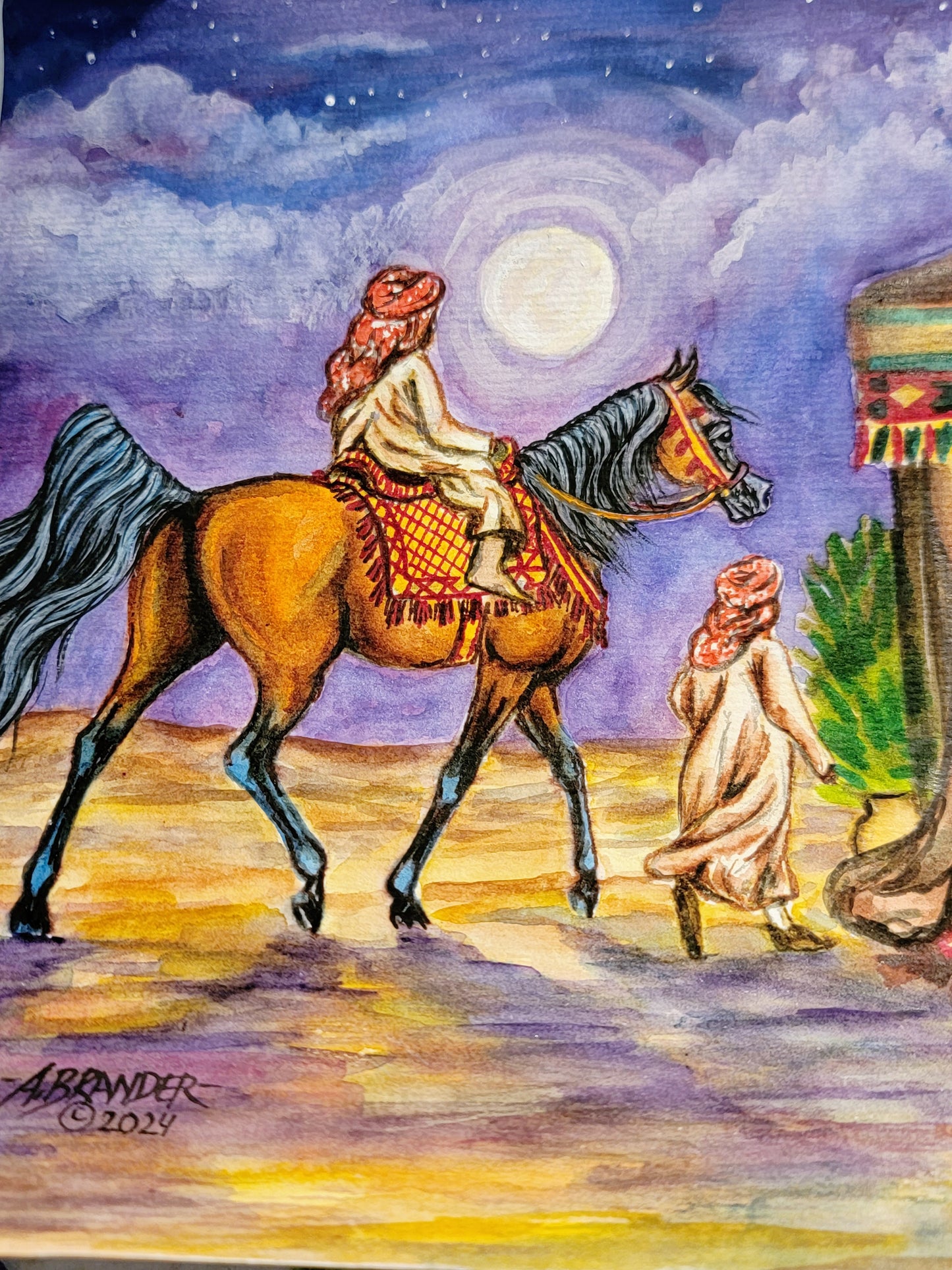 This stunning original watercolor painting, measuring 8.3 x 11.75 inches (A4 size), captures a serene desert night under a full moon, where a young boy leads his younger brother on their prized Arabian mare toward a gathering of family for tea and stories. Rich in detail, the vibrant colors and intricate design bring to life the warmth of tradition and family unity. Painted on 140-pound, acid-free, cold-pressed watercolor paper, this piece was meticulously crafted over the course of 16 hours. The texture of the paper enhances the depth of each brushstroke, offering a lasting piece that preserves both its beauty and vibrancy for years to come. Perfect for collectors of Arabian horse art, or anyone seeking a piece that evokes the timeless bonds of family and heritage.