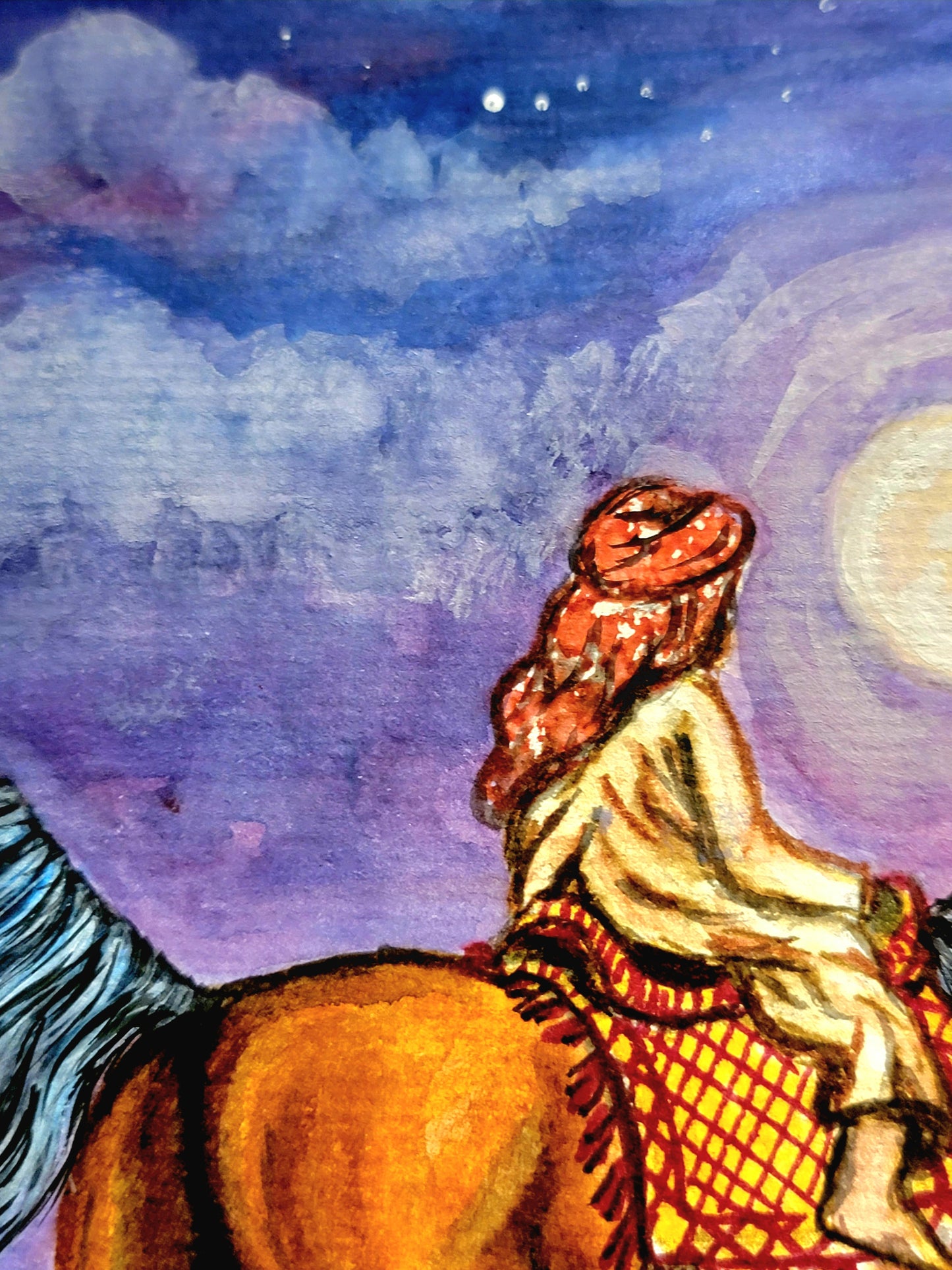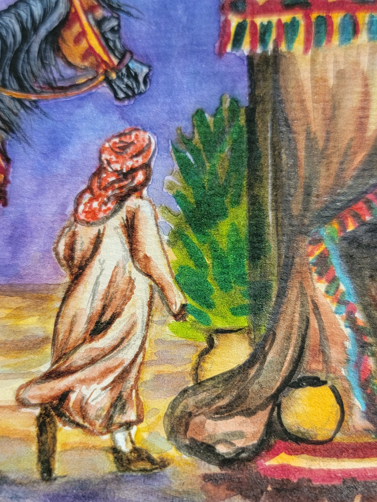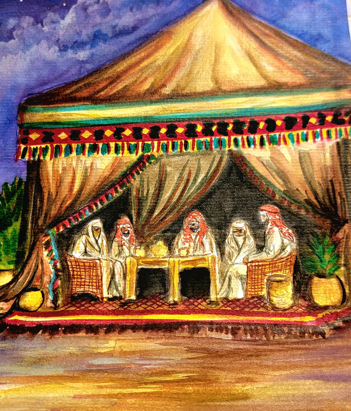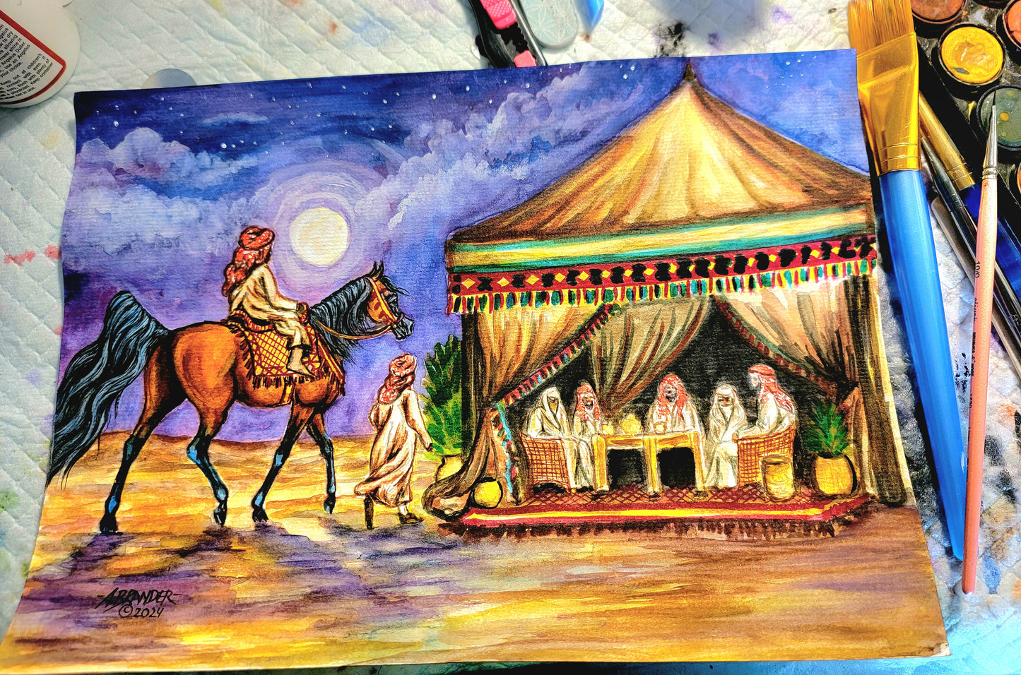 This stunning original watercolor painting, measuring 8.3 x 11.75 inches (A4 size), captures a serene desert night under a full moon, where a young boy leads his younger brother on their prized Arabian mare toward a gathering of family for tea and stories. Rich in detail, the vibrant colors and intricate design bring to life the warmth of tradition and family unity. Painted on 140-pound, acid-free, cold-pressed watercolor paper, this piece was meticulously crafted over the course of 16 hours. The texture of the paper enhances the depth of each brushstroke, offering a lasting piece that preserves both its beauty and vibrancy for years to come. Perfect for collectors of Arabian horse art, or anyone seeking a piece that evokes the timeless bonds of family and heritage.