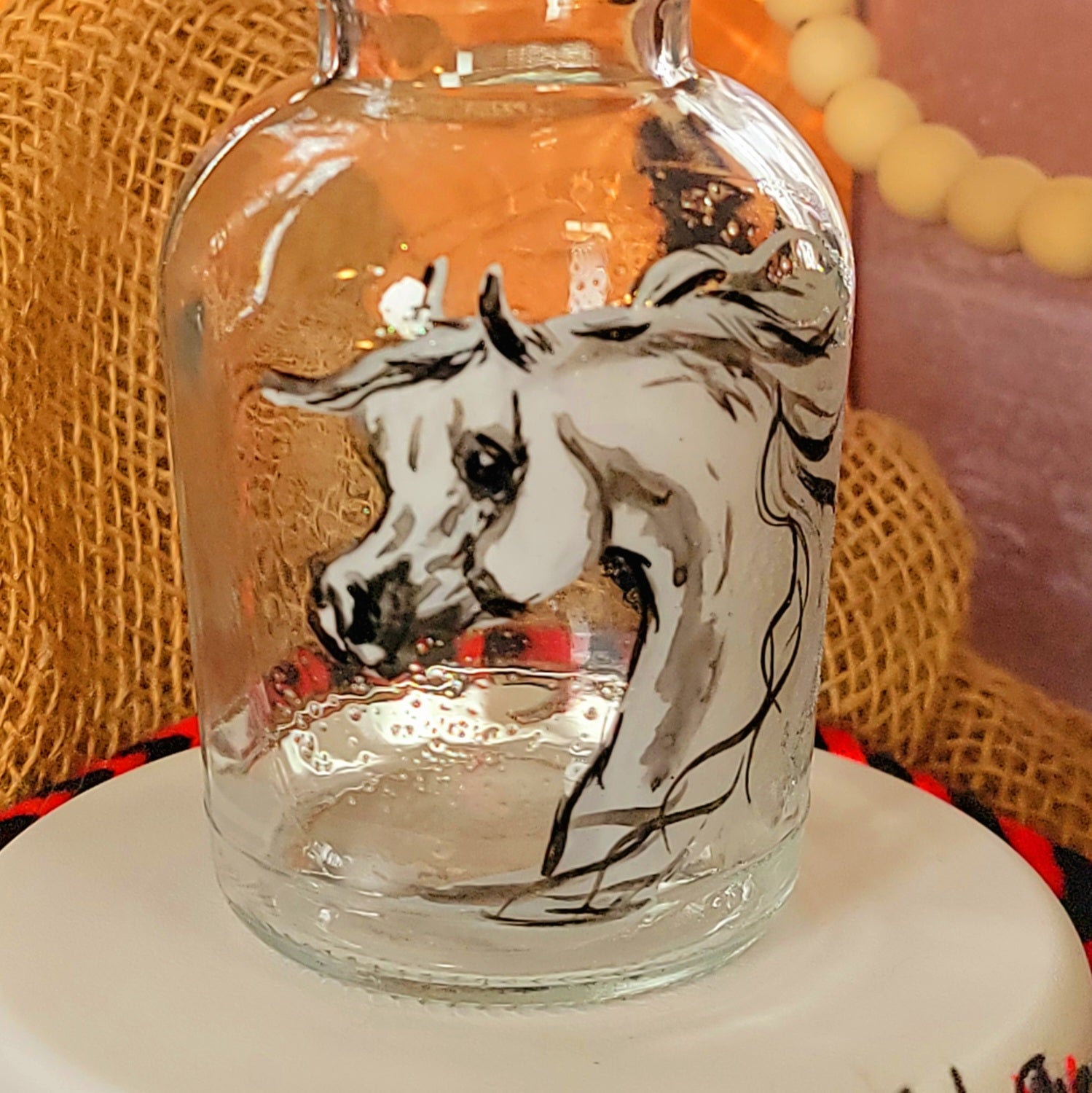 Experience the luxury and elegance of our Arabian Horse hand painted oil or syrup bottle. Made from exquisite glass and featuring a beautiful horse design, this bottle is perfect for storing your favorite blends of olive oil, balsamic vinegar, or honey and syrup. Each bottle is hand painted, making it a unique and exclusive addition to your kitchen collection. Choose from our available inventory and elevate your culinary experience.