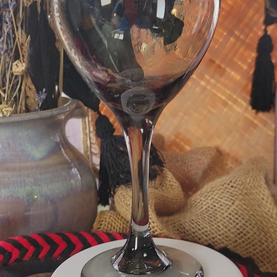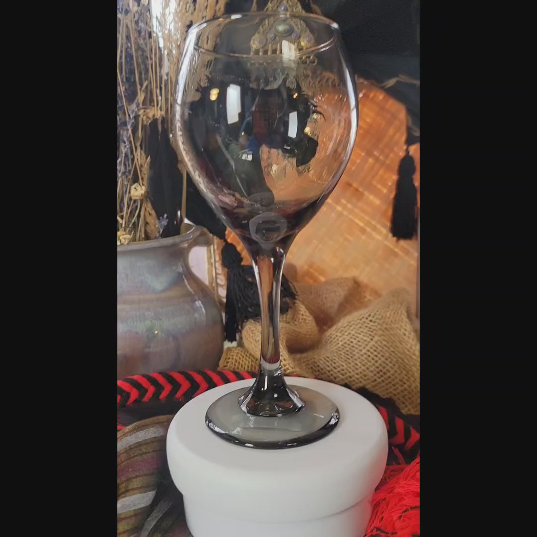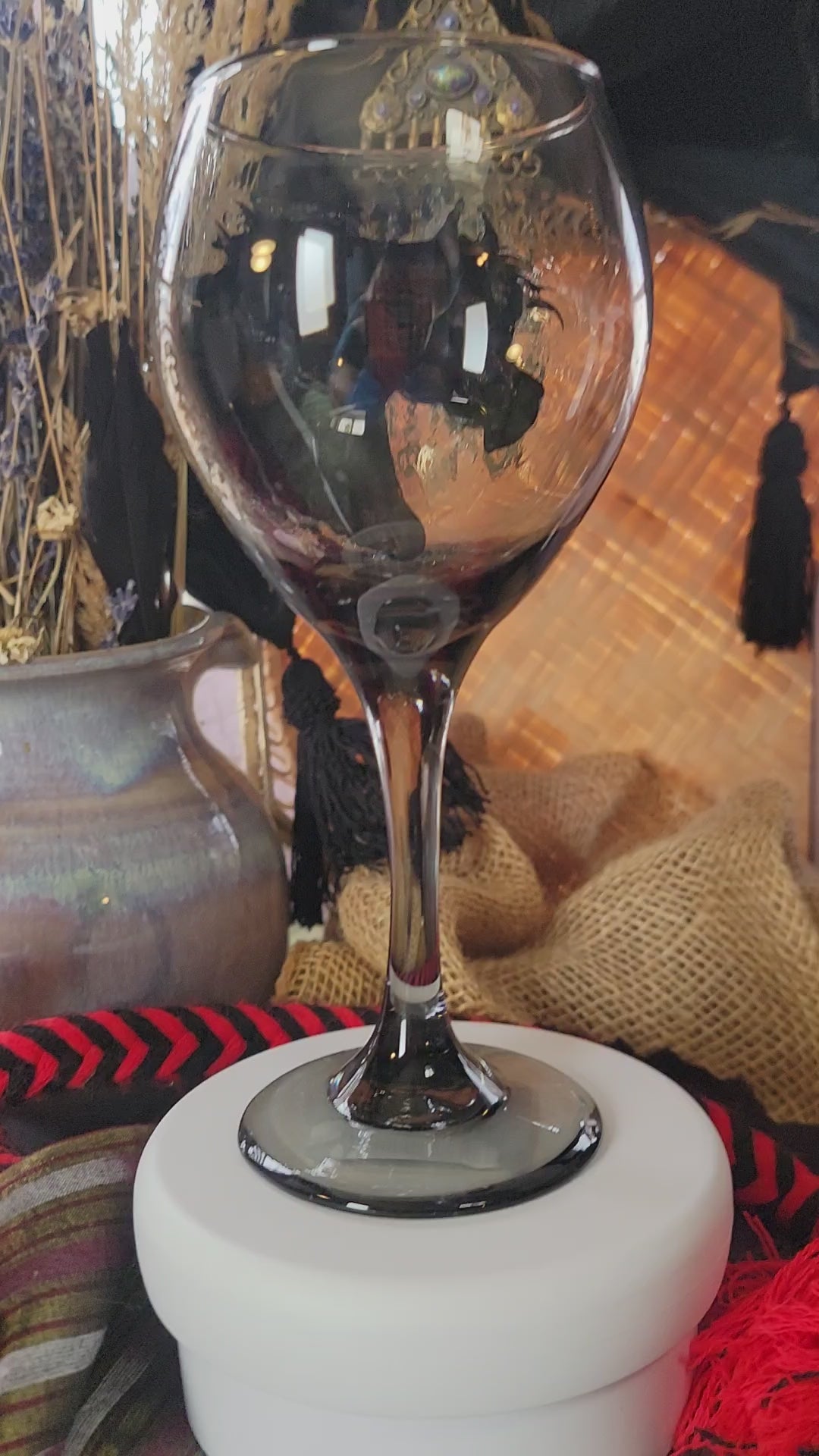 Raise your glass to beauty and spirit. This smokey wine glass is hand-painted with the image of an Arabian horse, shimmering in silver and rainbow hues that shift with the light. No two are ever alike, each one lovingly created by hand with Studio1027’s unique resin technique.