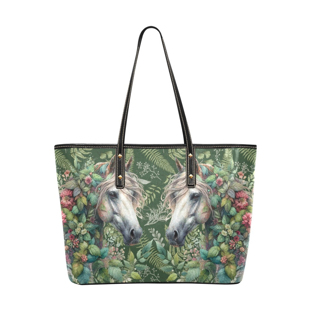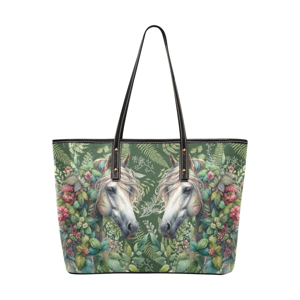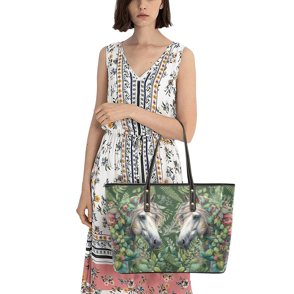 Elevate your style with this chic leather tote bag, perfect for both everyday wear and work attire. The stunning baroque horse design adds a touch of elegance, while the spacious compartment can hold all your essentials. Crafted with premium details and high-quality PU leather, this handbag will elevate any outfit. The rivet detail on the bottom of the strap adds a unique flair, while the secure zip fastening ensures easy access to your belongings. Make a statement with this beautifully crafted, botanical-inspired tote featuring beautiful horses with floral elements.