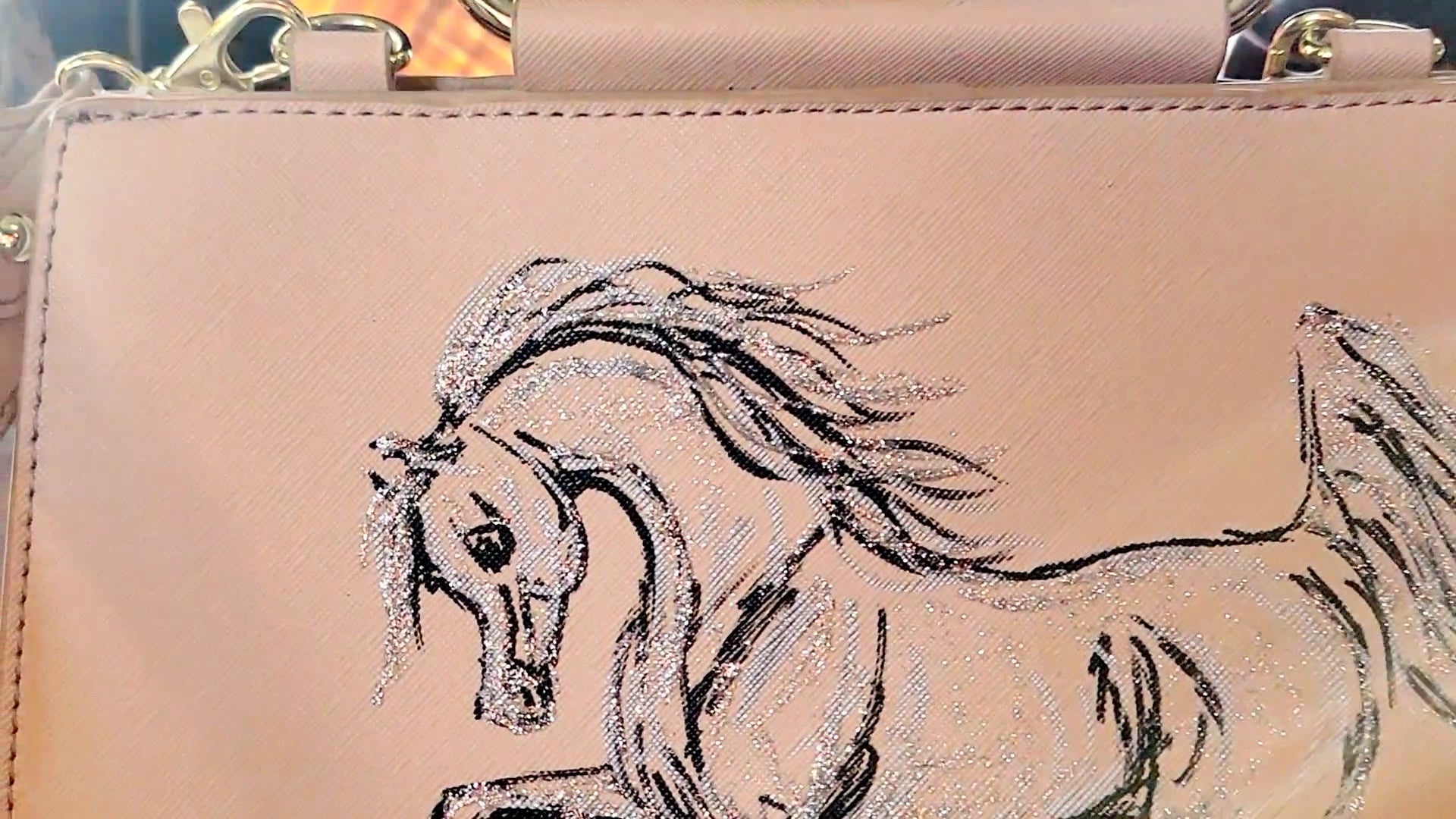 "Add a touch of whimsy to your wardrobe with our Cute Arabian Horse handbag. Hand-painted with 2 original horse paintings, this upcycled pink bag is both beautiful and versatile with a gold handle and shoulder strap. Don't miss out on this unique, excellent condition piece!".