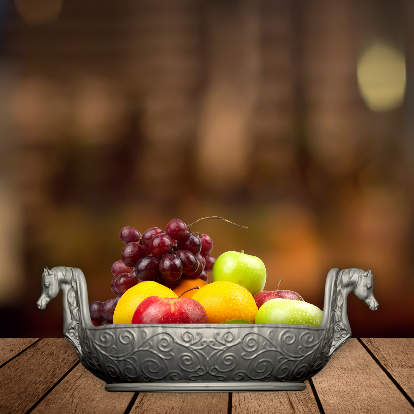 Design: Ornate bowl with twin Arabian horse busts and intricate filigree details