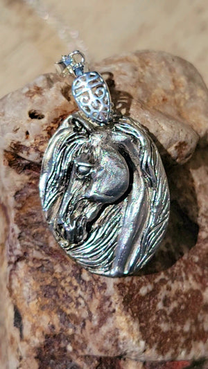 Experience elegance and beauty with our Pewter Horse Necklace. Crafted with exquisite detail, this necklace features a stunning Pewter Horse Head sculpture, cast from an original design. Perfect for any horse lover, add a touch of sophistication to your look.