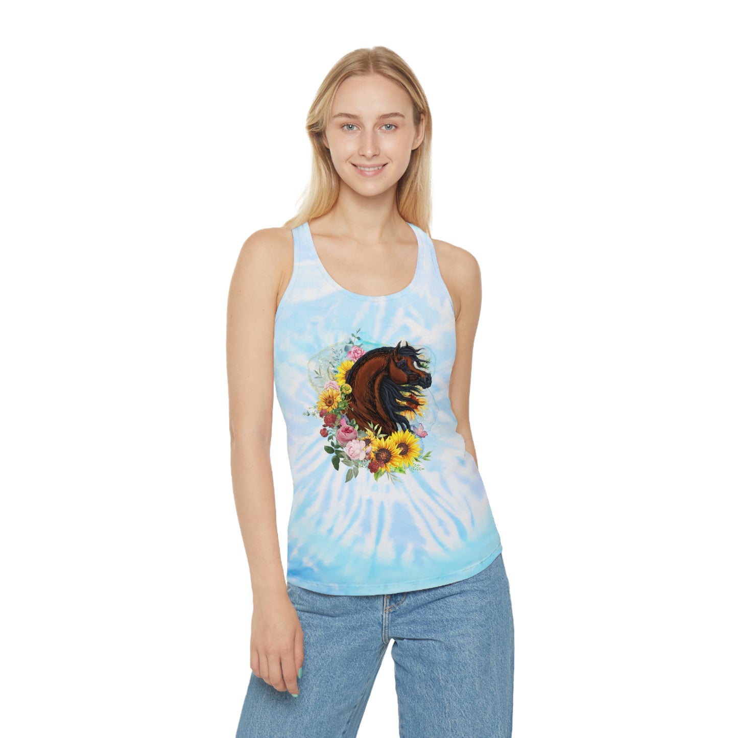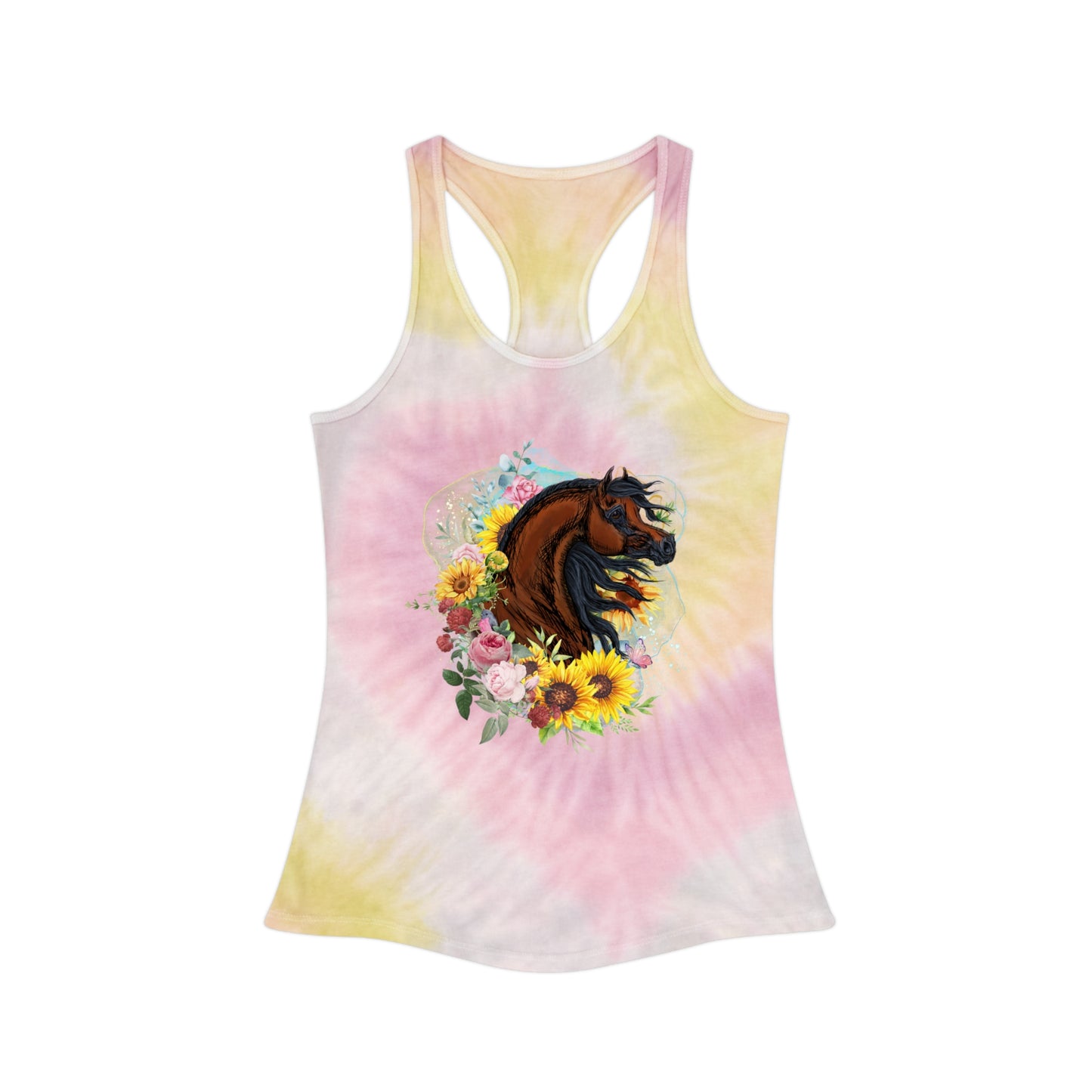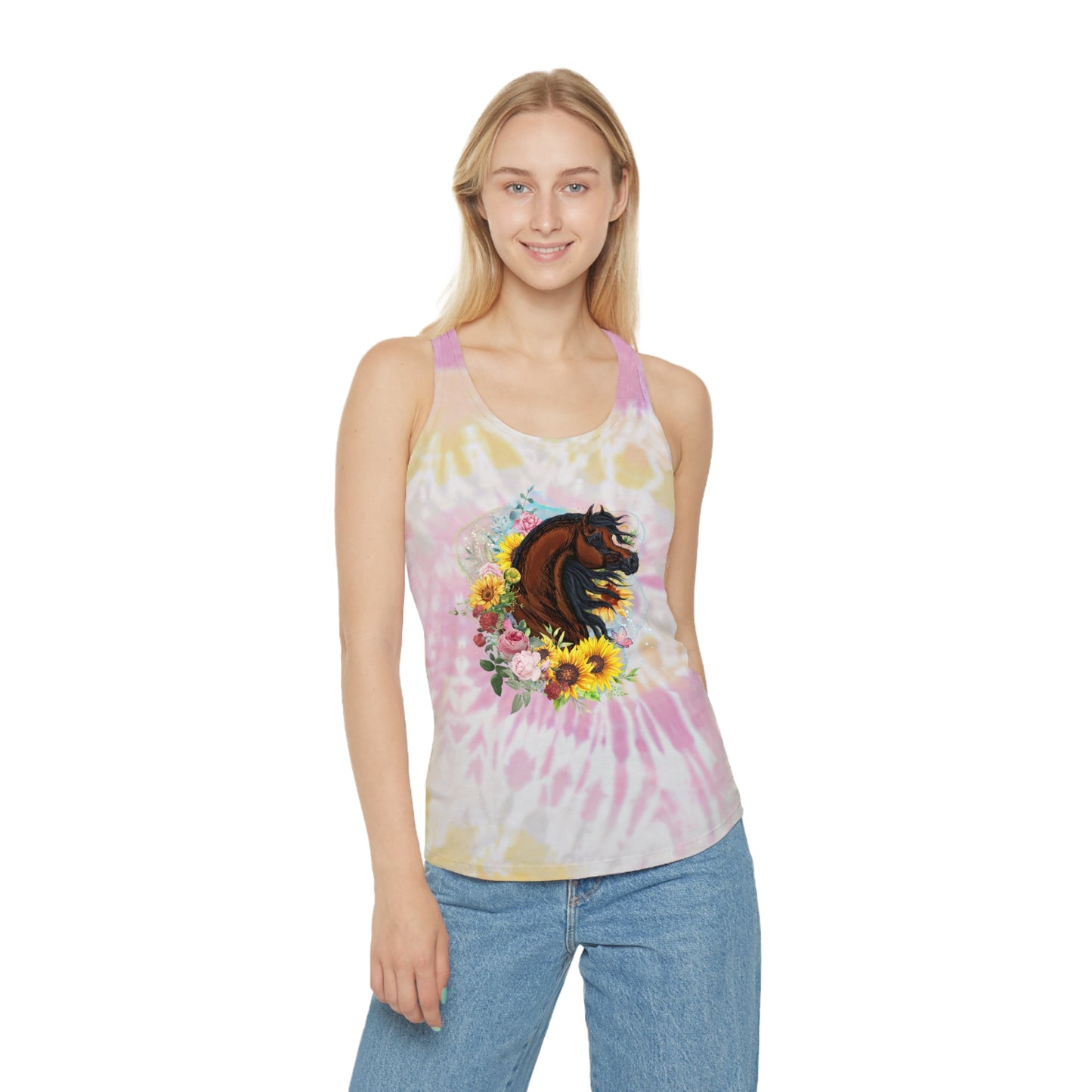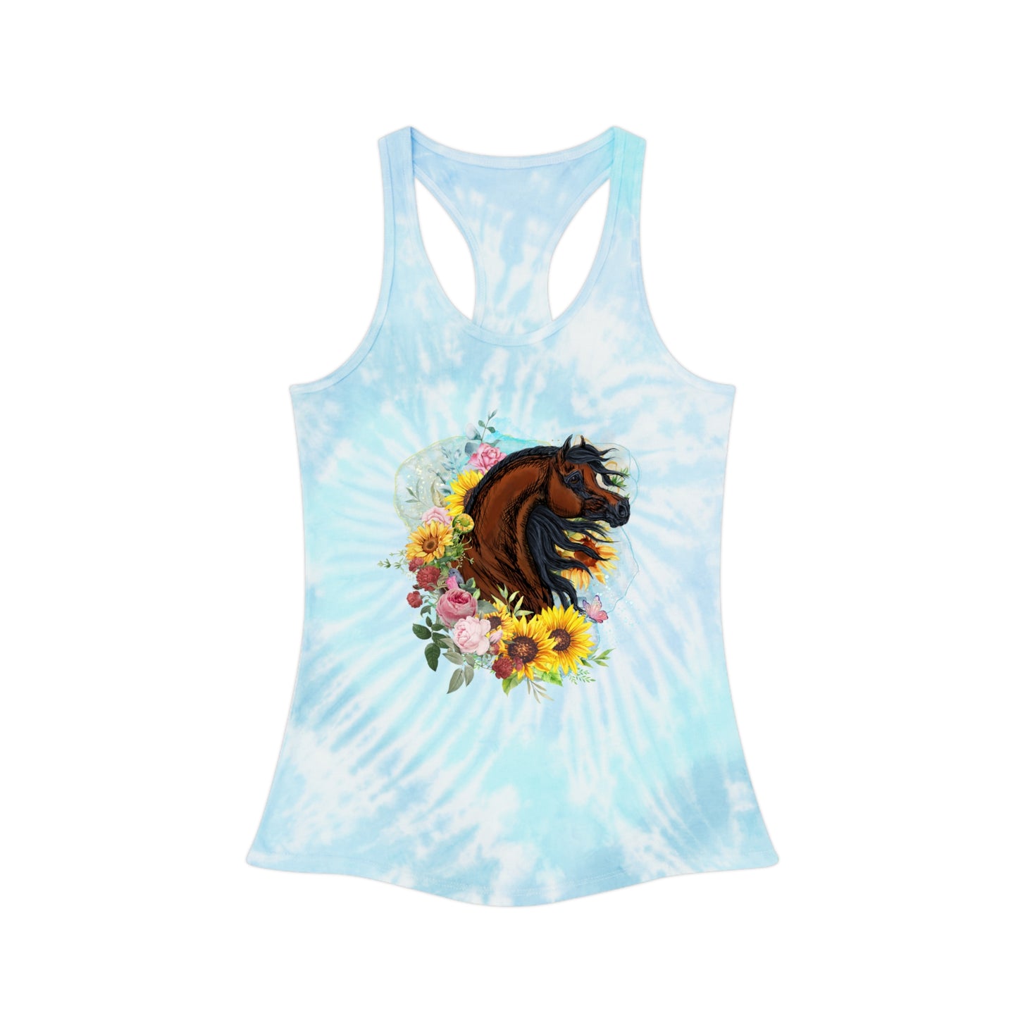 Unique Tie-Dye Racer Back Tank Top with Bay Arabian Horse, Sunflowers and Roses Equestrian Shirt Gift for Horse lover